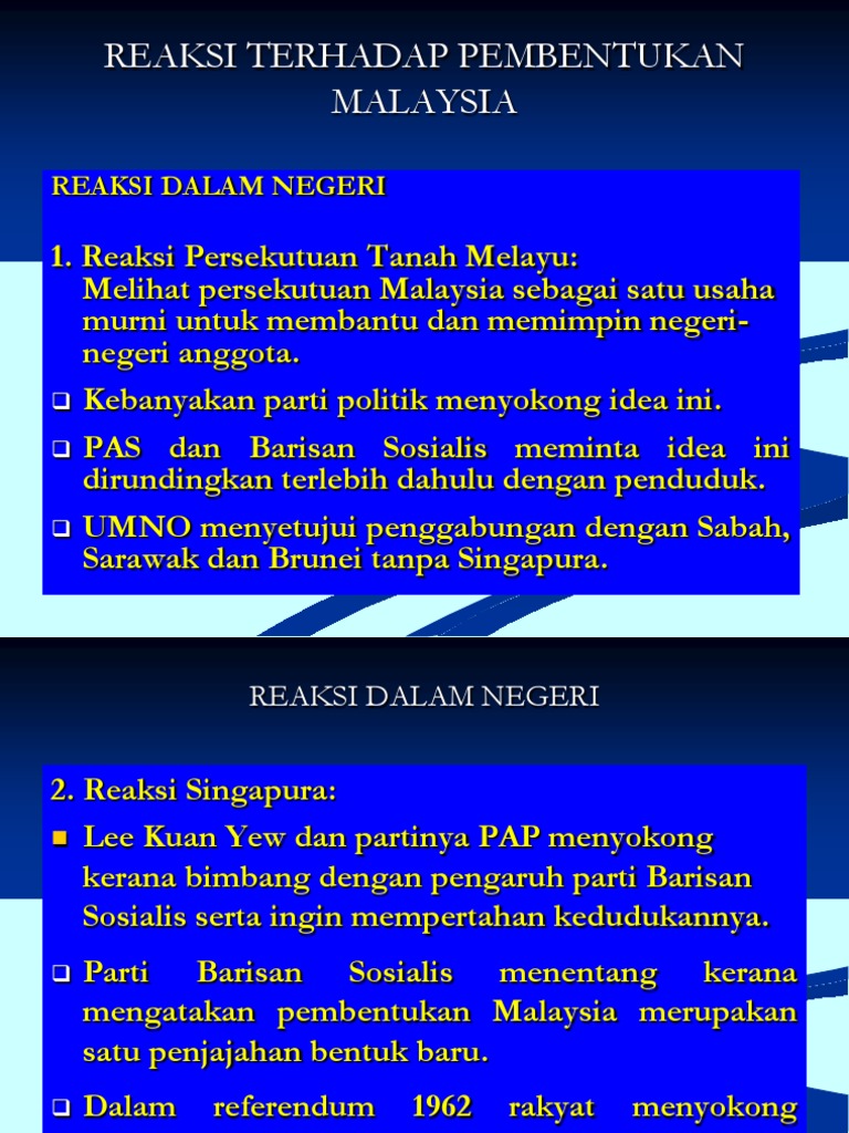Penetangan yang hebat datang daripada parti rakyat brunei dibawah pimpinan a m azahari. Sebahagian besar rakyat negari asal berminat tetapi darjah minat itu berubah ubah dari semasa ke semasa. Subandrio mengisytiharkan dengan rasmi penentangan kerajaan indonesia terhadap pembentukan malaysia. Reaksi sabah dan sarawak terhadap pembentukan malaysia 1 reaksi singapura terhadap pembentukan malaysia 1 revolusi perindustrian 1 rom dan china 1 saidina ali bin abu talib 1 sbp dan kluster 1 sebab candi dibina 1 sebab islam diterima 1 sebab masyarakat arab quraisy menentang islam 1 seni bina dalam tamadun china 1 sistem.