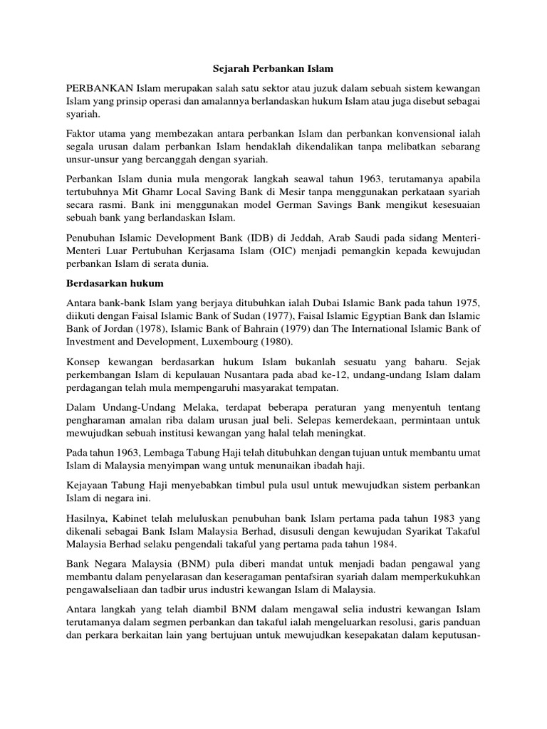 Sejarah perbankan islam perbankan islam merupakan salah satu sektor atau juzuk dalam sebuah sistem kewangan islam yang prinsip operasi dan amalannya berlandaskan hukum islam atau juga disebut sebagai syariah. This article discusses the historical development of islamic banking system in malaysia followed by the establishment of the interest free banking schemes the principles ofprofit and loss sharing. Sebelum 1993 malaysia hanya mempunyai sebuah bank islam dengan 36 cawangan yang terhad. Adanya perbankan syariah di indonesia dipelopori oleh berdirinya bank muamalat indonesia yang diprakarsai oleh majelis ulama indonesia mui dengan tujuan mengakomodir berbagai aspirasi dan pendapat di masyarakat terutama masyarakat islam yang banyak berpendapat bahwa bunga bank itu haram karena termasuk riba dan juga untuk mengambil prinsip kehati hatian.