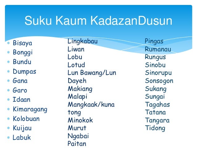 Salah satu teori mengatakan kaum ini asalnya dari suku bunun di taiwan kaum etnik kadazan dusun ini menggunakan pelbagai bahasa dan dialek dengan pelbagai kebudayaan dan adat resam tradisional. Rakyat dan sejarah sabahpenduduk sabah terdiri daripada 33 kumpulan pribumi yang berkomunikasi dalam lebih 50 bahasa dan 80 dialek etnik. Adat adat yang mereka amalkan diwarisi oleh nenek moyang mereka sejak dahulu kala lagi dan adat dat telah menjadi ikutan generasi hari ini walaupun tidak semua yang masih berpegang dan mengamalkan adat yang diwarisinya. Sarawak merupakan negeri terbesar di malaysia yang mana komposisi kaum yang terbesar adalah iban dikuti cina melayu dan lain lain.