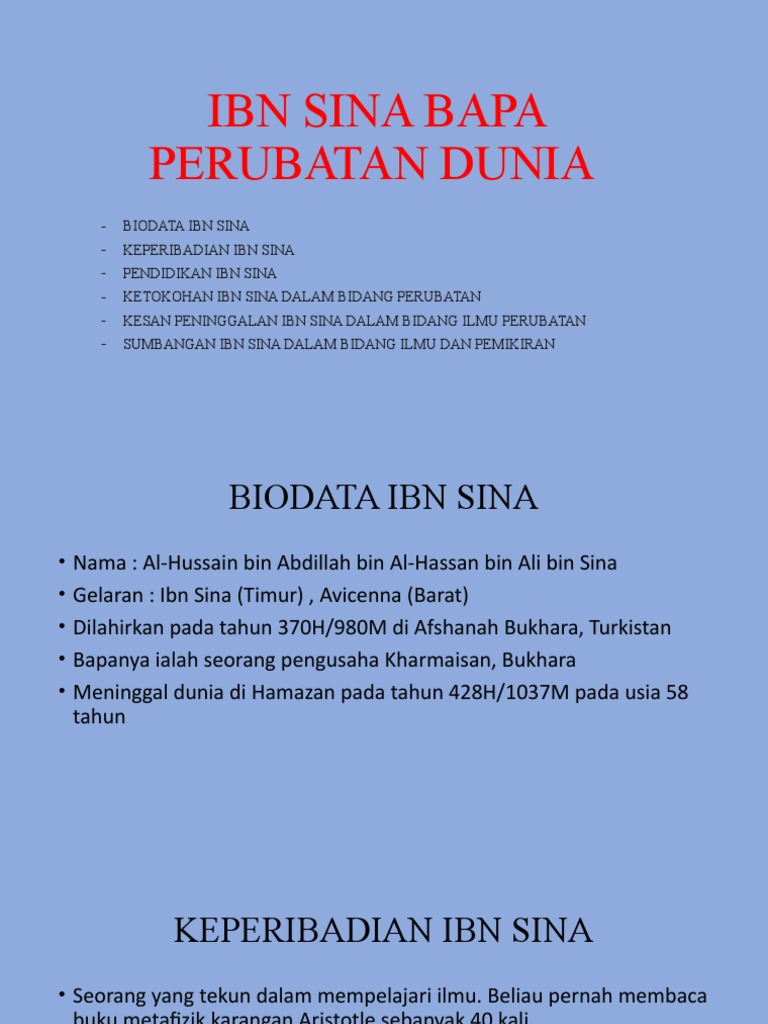 Sumbangan ibnu sina dalam bidang perubatan pendidikan islam tingkatan 5. Ibnu sina bapa perubatan 1. Sumbangan ibn sina dalam bidang geologi kimia serta kosmologi memang tidak dapat disangsikan lagi. Kesan peninggalan ibnu sina dalam bidang ilmu perubatan beliau telah memperkenalkan method pemerhatian dan analisis yang banyak membawa kemajuan dalam bidang perubatan hingga ke hari ini. Syeikh tahir jalaluddin 12.