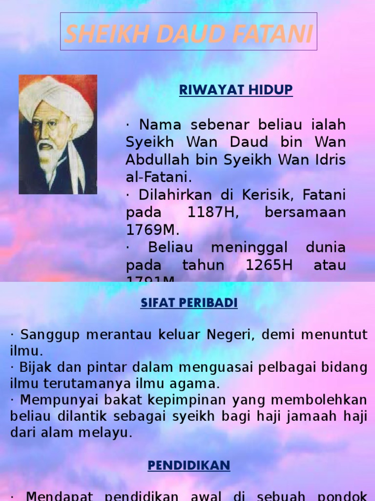 Syeikh daud al fatani pdf. Diberikan kepada syeikh daud oleh para guru dan murid beliau. Walaupun syeikh daud al fatani dilahirkan dan dibesarkan sehingga remaja di patani tapi berdasarkan maklumat yang didapati beliau mendapat pendidikan awal di tanah air dalam tempoh yang singkat. 15 wan mohd saghir abdullah 2006 munyatu al musalli sheikh daud bin abdullah al fatani. A book written in jawi entitled furu al masa il by syeikh daud al fatani an islamic religious work is considered a masterpiece in the field of islamic jurisprudence at the time of his appearance.