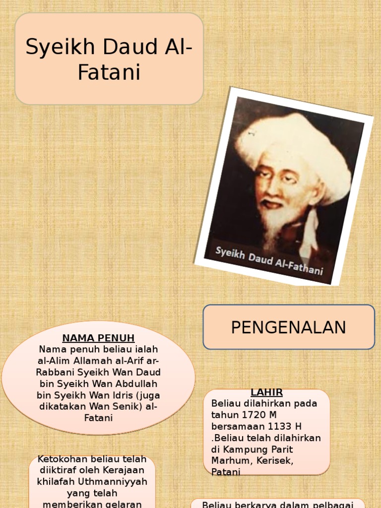 Syeikh daud al fathani adalah keturunan tok wan faqih ali dari jalur ibu dan ayahnya. Sources underlying this work are the works of sheikh daud al fatani such as al durr al thamên ward al zawéhir and jawéhir al saniyyah. Syeikh daud al fathani dan kawan kawannya telah belajar di mekah selama 30 tahun dan lima tahun di madinah. Ibunya bernama wan fathimah anak wan salamah bin tok banda wan su bin tok kaya rakna diraja bin andi faqih ali datok maharajalela bin mustafa datu jambu sultan abdul hamid syah bin sultan muzaffar waliullah bin sultan abu abdullah.