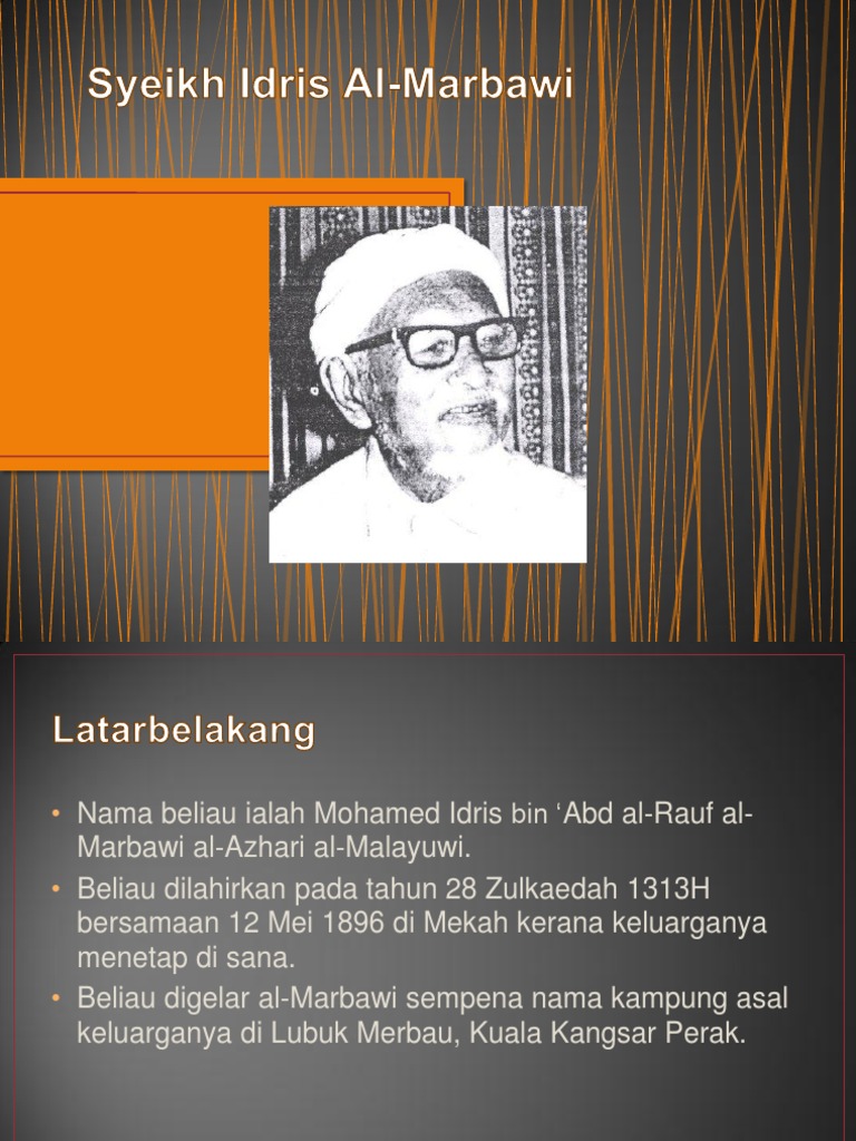 Yang disimpan di pusat islam malaysia sekarang jakim. Syeikh mohd idris bin abdul rauf al marbawi adalah seorang ulamak besar yang tidak asing lagi bukan saja di nusantara malahan di mesir dan makkah terutamanya dalam bidang bahasa arab ilmu hadis tafsir dan fiqah. Kertas ini dibentangkan dalam seminar kebangsaan ketamadunan islam pada 8 9 disember 2009 di hotel casuarina ipoh perak. Beliau telah dilahirkan pada tahun 1893 dan secara tepatnya pada tahun 28 zulkaedah 1313 hijrah di makkah.