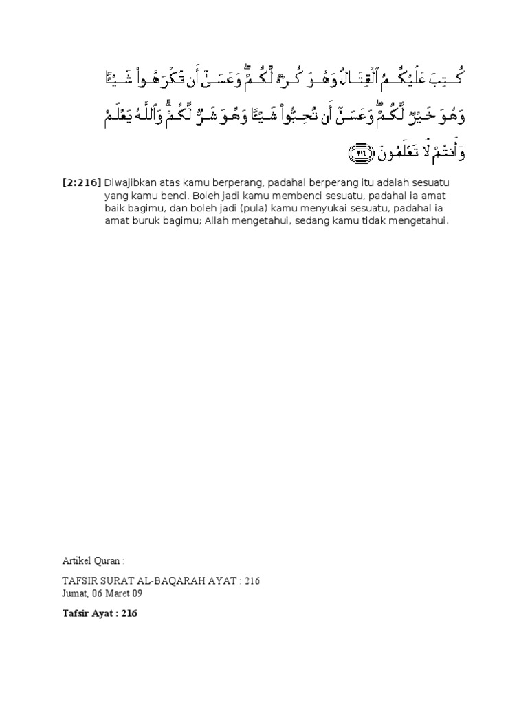 Tafsir surah al baqarah ayat 216. Oleh kementrian agama ri. Dan secara naluriyah kewajiban ini tidak menyenangkan bagi jiwa manusia karena kewajiban ini menuntut pengorbanan harta dan jiwa. Tafsir quran surat al baqarah ayat 216. Ini adalah pengulangan semula tajuk jihad selepas disebut ayat tentang infaq.