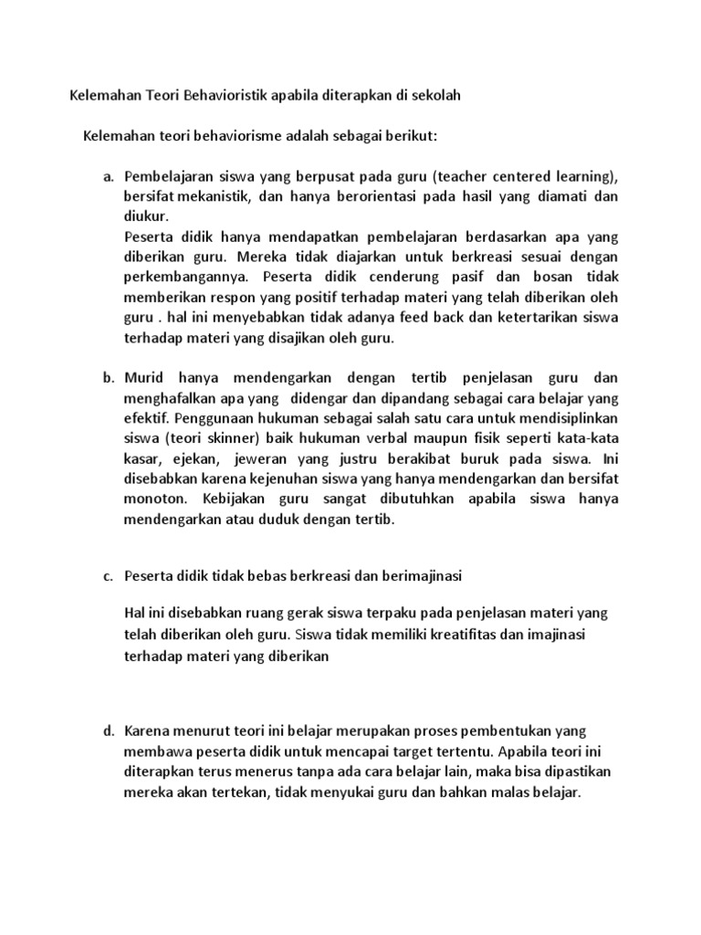 Teori behaviorisme dalam pembelajaran pdf. This free education essay on essay. Yang dirumuskan dalam teori teori pembelajaran behaviorisme. Penerapan teori belajar behavioristik mudah sekali ditemukan di sekolah. Penerapan teori skinner dalam belajar 1 hasil belajar harus segera diberitahukan kepada siswa jika salah dibetulkan jika benar diberi penguat.