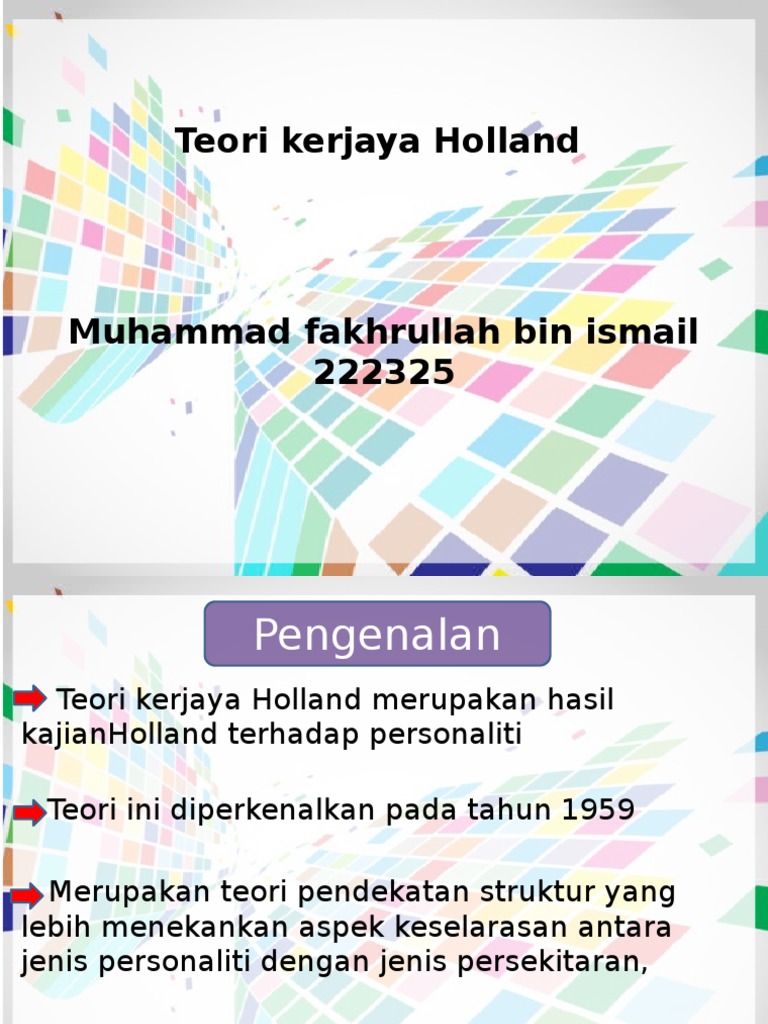 Teori pemilihan kerjaya holland. Teori pemilihan kerjaya holland memberi fokus kepada trait personaliti dan banyak dipengaruhi oleh teori trait dan faktor sebelum ini. Teori ini juga pada dasarnya merupakan teori pendekatan struktur yang lebih menekankan aspek keselarasan antara personaliti dengan persekitaran namun teori ini juga telah diperkembangan dalam aspek bagaimana personaliti terbentuk dan berkembang. Teori pemilihan kerjaya holland merupakan hasil kajian holland terhadap personaliti yang memfokus kepada tipologi dan banyak dipengaruhi oleh tret dan faktor. Memadankan individu dengan pekerjaan iaitu memadankan potensi diri dengan kerjaya yang sesuai.