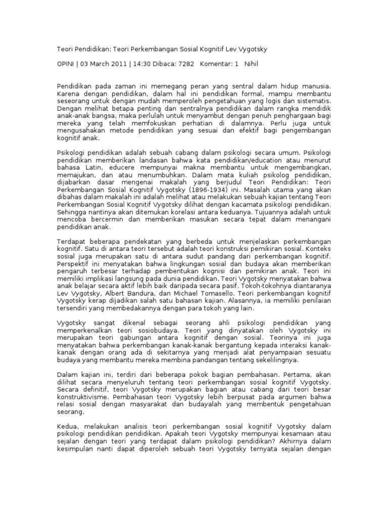 Kedua melakukan analisis teori perkembangan sosial kognitif vygotsky dalam psikologi pendidikan pendidikan. Pdf teori perkembangan anak berdasarkan piaget dan vygotsky di sekolah dasar find read and cite all the research you need on researchgate. Pergaulan dan interaksi yang bermakna ini selalunya berlaku antara kanak kanak dengan individu yang lebih berpengetahuan darinya. Lev vygotsky 1896 1934 memberi alternatif kepada idea piaget tentang perkembangan kognitif kanak kanak di mana dia menekankan peranan sosial dan budaya dalam perkembangan minda kanak kanak.