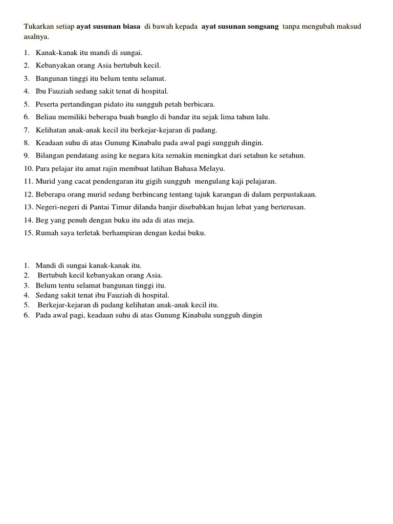 Tukar ayat biasa kepada ayat songsang. Ayat songsang pula terbentuk daripada proses transformasi ayat biasa. Ayat tunggal mempunyai dua bentuk susunan iaitu. Tukar ayat ayat di bawah ini kepada ay at bersusunan songsang tanpa mengubah maksud asalnya. I telah terkenal sebagai pusat bandar yang padat penduduknya bandar raya kuala lumpur.